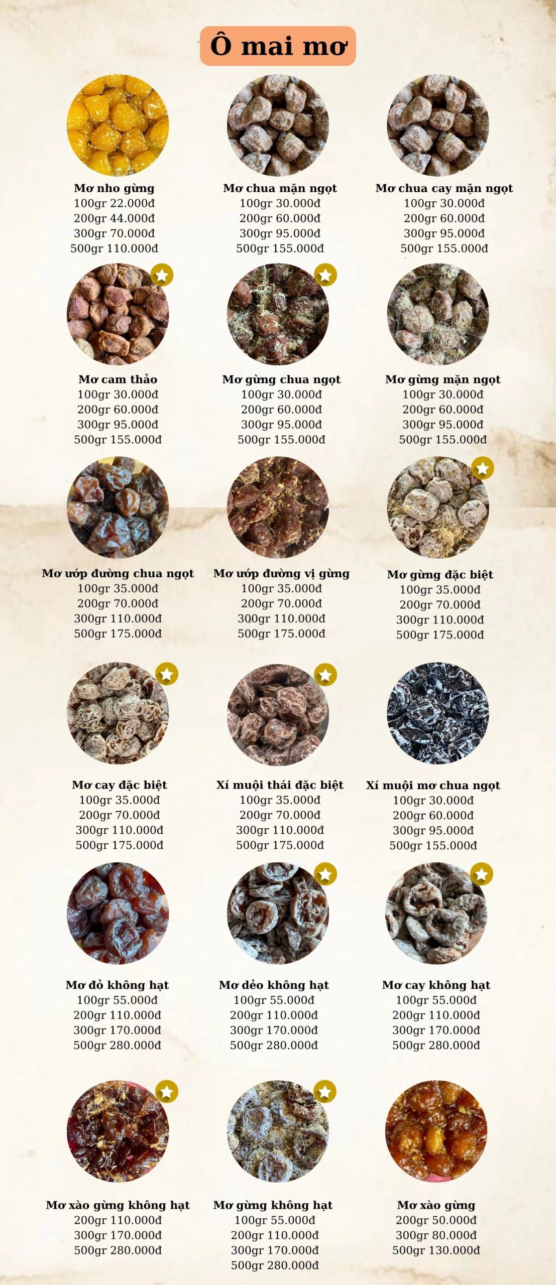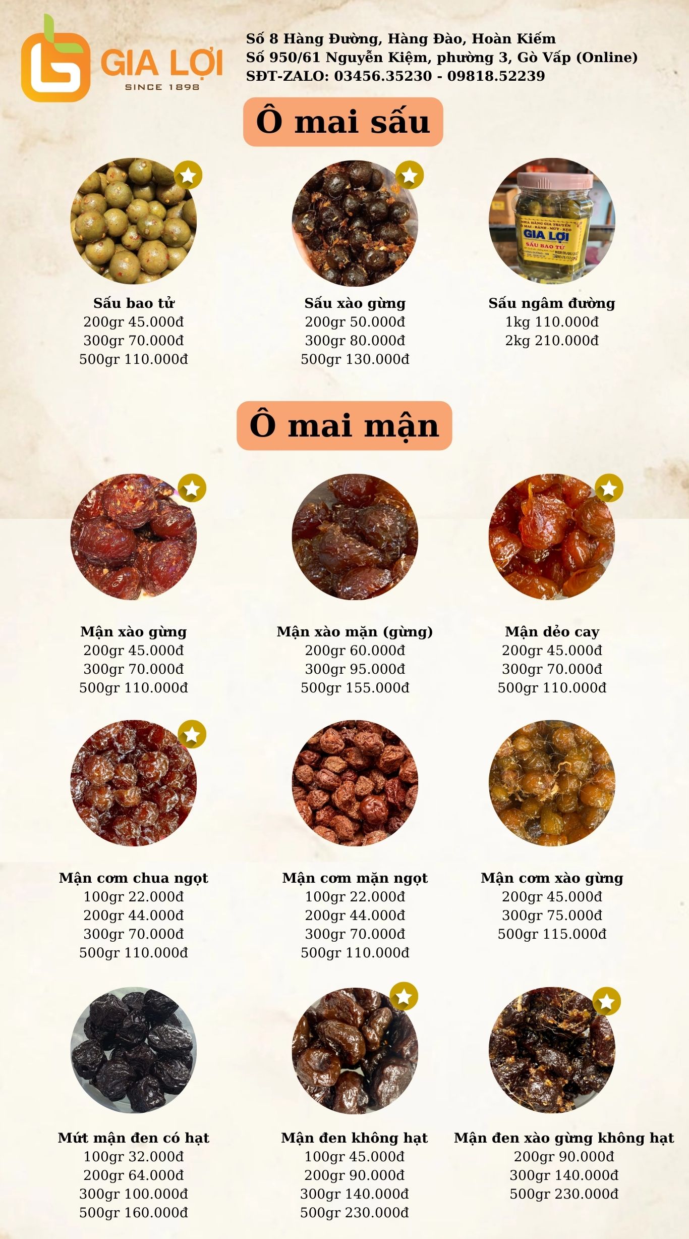 Cửa hàng xin gửi tới quý khách Menu ô mai Gia Lợi (cập nhật mới nhất từ ngày 15/09/2025) để quý khách có thể dễ dàng lựa chọn: